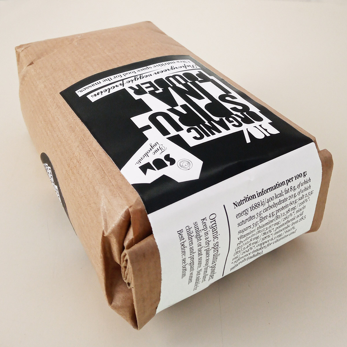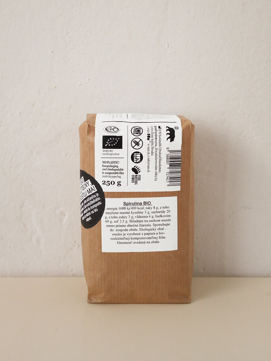 Supervýživný zelený prášok z jednobunkovej riasy Arthrospira. Výborný zdroj bielkovín ale aj niektorých mikronutrientov (vitamínov skupiny B, železa, medi). Vrecko z kompostovateľného materiálu a papiera.